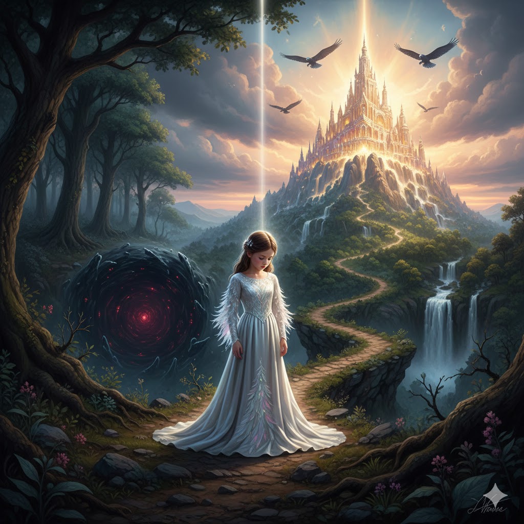 La un moment dat, văd fetița pe marginea unei prăpăstii. Pe de o parte, ”Hăul lui Lucifer”, căci așa se numea. Cineva spunea că acolo este abisul mândriei, egoismului și al iubirii de sine. Nu are rost să-l descriu. Fiecare îl poate cunoaște analizându-și propriul hău. Pe de altă parte, un munte înalt al cărui vârf nu se vedea de norii denși. Se numea muntele ”Eu Sunt Cel Care Sunt”. Fetița nu a înțeles acest lucru, dar a avut o vagă intuiție că acolo ar fi găsit ceva mai bun decât ce fusese în viața ei până atunci.