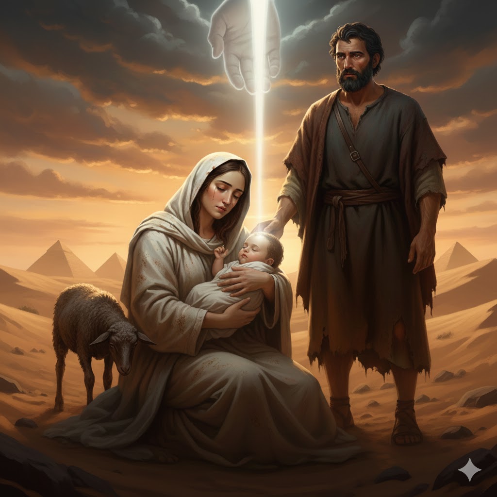 În Sfânta Familie nu a fost numai pace, seninătate și bucurie. Astăzi Evanghelia înfățișează fuga în Egipt. Pentru a salva Copilul de mânia lui Irod, Iosif și Maria se aventurează pe un drum plin de pericole. La vremea respectivă nu existau străzi, autostrăzi, mașini, avioane. Drumurile însemnau risc: în fața hoților, criminalilor, animalelor sălbatice, capriciilor vremii. Este foarte interesant de văzut cum Dumnezeu alege să se nască și să trăiască în însăși inima slăbiciunii și a răutății noastre. Oare nu putea să trimită o armată de îngeri ca să-l ducă pe Isus în Egipt?