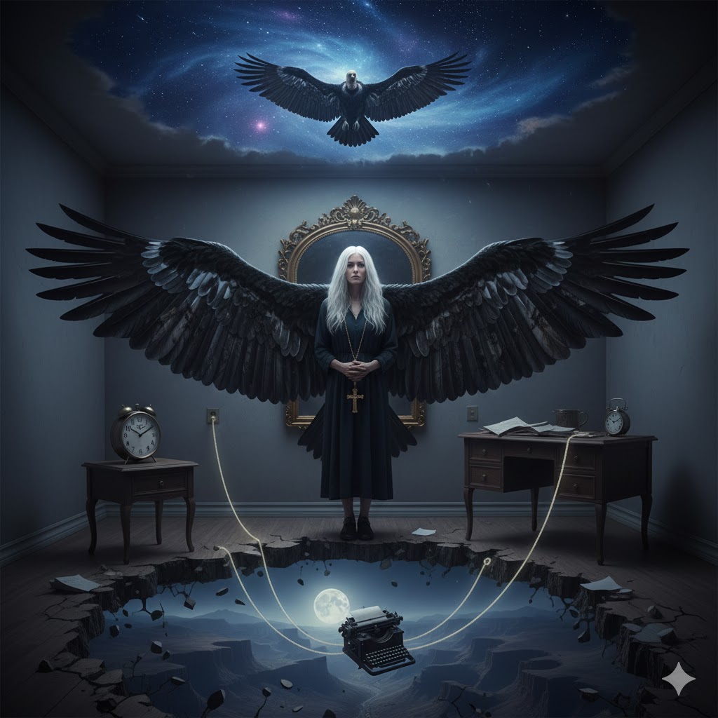 Vulturul se înalță tot mai sus, însă ochii mei obosesc, îi închid și mă trezesc în camera mea. Încerc să mă mișc, dar simt ascuțimea durerii. Mă uit în sus și văd tavanul, mă uit spre fereastră și o văd închisă, mă uit la ceas și văd că secundarul se mișcă cu o precizie sfidătoare. Fac un efort să mă ridic, ajung în fața oglinzii și rămân perplexă: părul meu era alb, iar în locul mâinilor îmi crescuseră aripi negre.